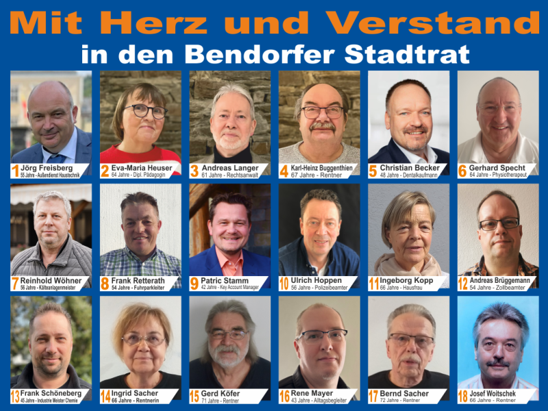 18 engagierte Bürgerinnen und Bürger, 18 Köpfe, 18 Nachbarn aus und für Bendorf, die eine Politik machen möchten, in der die Bedürfnisse der Menschen…